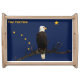 A Bald Eagle (Haliaeetus leucocephalus) scans the sky from his perch on a tree branch; superimposed on a flag of Alaska. Customize by adding your own text.