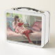 This is a standard metal lunchbox that appears to work just fine. We designed this box ourselves with an uploaded photo and custom text on the front and back. It looks absolutely beautiful except the front of the lunchbox is not centered like it shows in the photo. The print borders don't align with the inset flat part of the box where the preview photo online showed it perfectly centered in there. The back looks nice and centered though.