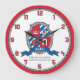 Knights style shield monogram letter A art name simple numbered wall clock in shades of red, blue white and grey. Personalize with your child's own name and name meaning for a personalized touch to your child's bedroom or nursery, this example is for names starting with the letter A. Currently reads Alec Defender of mankind. Understanding and wise. Ideal for a gift to a new baby boy, for a christening, baby naming or baby shower gift. Unique shield drawing, graphic art, name research, wording and design by Sarah Trett. www.sarahtrett.com for www.mylittleeden.com