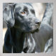 Photo of alert black labrador retriever dog on poster.