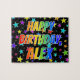This fun, exciting, birthday-themed jigsaw puzzle design has the message "HAPPY BIRTHDAY, ALEX" with the characters having a colorful rainbow spectrum inspired gradient pattern, along with a lively stars background pattern. An exciting puzzle like this might be used to send birthday wishes to somebody named Alex. [~Z0000468]