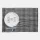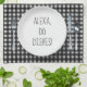 Alexa electronic device command for washing dishes on white dinner plate on black and white gingham pattern.