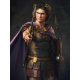 “Alexander the Great” - Conqueror of Empires. A stylized depiction of Alexander the Great. A young man in his late twenties with piercing blue eyes, standing confidently. He has long light brown or dark blond, wavy hair. He wears a finely crafted bronze cuirass (breastplate) adorned with intricate engravings, possibly featuring mythological scenes or symbols of his divinity. Over his shoulders, he wears a short, flowing purple cloak (chlamys) fastened with a gold brooch at the right shoulder, symbolizing royalty. He holds a hoplon (shield) and a spear in one hand and a stylized depiction of his Kopis (sword) in the other. A golden wreath encircles his head, symbolizing his claim to divine ancestry.