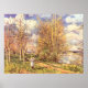 Alfred Sisley. Les Petits Prés in spring. Cute spring landscape. A woman is walking along a path lying on the river bank. Slender trees are not yet covered with leaves. White clouds are flying across the blue sky. Reproduction of famous works of art images in the public domain.