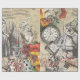 Fall down the rabbit hole with this enchanting design inspired by Lewis Carroll's timeless classic, "Alice's Adventures in Wonderland." This whimsical collage features antique illustrations of Alice peeking behind a curtain, the White Rabbit, the Mad Hatter's iconic hat, and playing card figures painting roses. Sprinkled throughout are vintage-style flowers, a classic pocket watch, and a bumblebee, all overlaid on a subtly patterned background with the memorable quote, "If I had a world of my own, everything would be nonsense" attributed to Alice. This design evokes the magical and nonsensical spirit of Wonderland, perfect for those who love literary art, Victorian aesthetics, and a touch of nostalgic fantasy.
