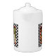 Medium white Porcelain teapot with a vintage Alice in Wonderland image, on both sides, of Alice and the Duchess on a black and white checkerboard background. See matching candy jar, mug, pitcher, paper plate and coasters. See the entire Wonderland Teapot collection in the FOOD/BEV | Dishes section.