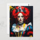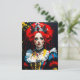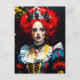 Imagining Alice as the Red Queen fantasy AI generated art in the colors of red,blue,yellow, black and white with ink splatters.