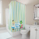 Cute Alice in Wonderland shower curtain with a fun childrens book theme. Little girl Alice in her blue dress and the Mad Hatter sit on pretty blue yellow striped bathroom decor. Customize this whimsical bath accessory with your child's name.