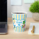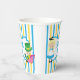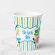 Cute Alice in Wonderland Happy Birthday paper cup for a book themed birthday party. Little girl Alice in her blue dress and the Mad Hatter in a teacup on a pretty blue border on a whimsical baby blue and yellow striped card. Drink Me at a children's tea party or bookworm.
