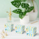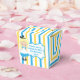 Pretty Alice in Wonderland theme birthday party favor box for a child's birthday. Little girl Alice in her blue dress and the Mad Hatter decorate this beautiful blue and yellow striped box.