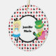Cute Alice in Wonderland theme custom Christmas ornament gift for a book lover or librarian who loves to read children's books. Little girl Alice in her blue dress and the Mad Hatter sit on top of a deck of cards pattern in red and black featuring spades and diamond symbols. Customize with your own text.