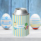 Cute Alice in Wonderland custom can cooler for a children's tea party. Sweet little girl Alice in her blue dress and the Mad Hatter sit on a pretty blue border on a whimsical blue and yellow striped pattern. Customize with your own text for a cheerful kids unbirthday party favor.