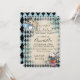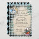 This enchanting, colorful custom party invitation features an Alice in Wonderland fairy tale theme. The background features a blue and black harlequin pattern around the border with a parchment paper style canvas in the center text area. An illustrated, gothic style blonde Alice, with a blue dress and black and white striped stockings is placed in the top left corner. The iconic white rabbit is pictured in the bottom right, holding his infamous pocket watch and sitting in a stack of tea cups. It's perfect for a tera party, birthday party, or other Alice in Wonderland themed celebration.