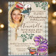 This whimsical and enchanting party invitation features a colorful Alice in Wonderland fairy tale theme. The Cheshire cat is placed in the bottom right corner next to a couple of teacups. The white rabbit is placed near the top, in front of a gold colored looking glass or mirror. A sample photo is placed inside the mirror which you can replace with your own photo or custom image. A blue and black harlequin pattern accents the border. It's perfect for a birthday party, tea party, or other Alice in Wonderland themed celebration.