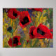 Painted brilliant red poppies gathered in a field of yellow and purple sprigs of wild flowers