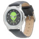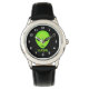 Green Alien cartoon watch personalized with kids name or monogram letter. Cute space theme timekeeper clock design for little boys Birthday party. Make one for son, grandson, new baby, grandchild etc. Extraterrestrial life form illustration for children.