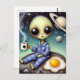 A funny Alien dressed in PJs with a coffee and egg sitting on a rock for breakfast in space adorable AI generated art