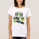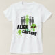 This image features a playful and whimsical design centered around the theme of aliens and fashion. A group of six cartoon aliens, depicted in a line, stand in front of the bold text "ALIEN COUTURE". The aliens are all green, with large eyes and simple, rounded bodies. The central alien is standing tall and is the largest of the group, while the others are shorter and more slender. The text "ALIEN COUTURE" is large and bold, written in black block letters, and appears to be draped over the aliens, suggesting a connection between the extraterrestrial beings and the world of fashion. The design is vibrant and colorful, with a playful, almost childlike quality.