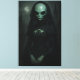 This artwork portrays an alien female figure in an exquisite gothic and mystical style. She has an elongated bald head and large, dark, otherworldly eyes, her skin a pale green that contrasts hauntingly with her attire. She wears a high-collared, intricately patterned black gown with flared lace sleeves and a corseted bodice, evoking Victorian mourning fashion. A sheer black veil drapes over her head and shoulders, enhancing her spectral presence. Around her neck hangs a striking pendant—a large pentagram enclosed in a circle, resting above delicate lacework. Behind her, under the eerie glow of a full moon, rise the silhouettes of gothic cathedral spires, adding depth to the dark, ritualistic atmosphere. The overall composition blends extraterrestrial features with occult elegance, making her appear both regal and unsettling, like a high priestess from another world