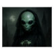 This artwork portrays an alien female figure in an exquisite gothic and mystical style. She has an elongated bald head and large, dark, otherworldly eyes, her skin a pale green that contrasts hauntingly with her attire. She wears a high-collared, intricately patterned black gown with flared lace sleeves and a corseted bodice, evoking Victorian mourning fashion. A sheer black veil drapes over her head and shoulders, enhancing her spectral presence. Around her neck hangs a striking pendant—a large pentagram enclosed in a circle, resting above delicate lacework. Behind her, under the eerie glow of a full moon, rise the silhouettes of gothic cathedral spires, adding depth to the dark, ritualistic atmosphere. The overall composition blends extraterrestrial features with occult elegance, making her appear both regal and unsettling, like a high priestess from another world