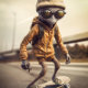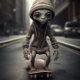 Watch as the enigmatic alien effortlessly glides through the bustling cityscape, defying gravity with every trick and turn. The vibrant colors and dynamic composition bring the scene to life, immersing you in a surreal fusion of intergalactic wonders and urban energy.