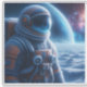 An astronaut clad in a heavy, frosty spacesuit stands on a desolate, icy surface, gazing at distant celestial bodies and a vibrant cosmic backdrop. The scene captures the solitude and wonder of space exploration during the early morning hours.