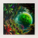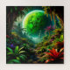 A surreal scene featuring a lush alien jungle under a stunning green planet. The vibrant colors and exotic plants depict a fantastical, dreamlike setting evoking adventure, exploration, and the mysteries of outworldly environments.