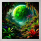 A surreal scene featuring a lush alien jungle under a stunning green planet. The vibrant colors and exotic plants depict a fantastical, dreamlike setting evoking adventure, exploration, and the mysteries of outworldly environments.