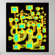 A colorful abstract network like structure perhaps reminiscent of a circuit or map of some kind. Digitally painted in yellow and turquoise with a red offset giving it an offset stenciled look. The design was partly created using digital oil paint effects which gives it an attractive hand painted stenciled look.