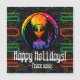 Custom alien tie dye space Christmas magnets! You can "personalize" the greeting, or keep it as is. Features alien with peace sign, tie dye round frame, year on the sides, patterned background, and cool alien typography.