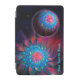 A very colorful, swirling, fractal image appears twice. Once superimposed on a starry, outer space background; a second time on a small sphere surrounded by a glowing aura. Perhaps a probe launched from a mother ship; or a cosmic egg. Add your own text.