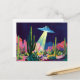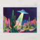A playful and mysterious design featuring an alien UFO hovering over a desert landscape.