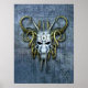This horned alien war mask is a menacing sight to behold, with its skull-like appearance and sharp metal spikes protruding from its chin and gold spiral horns. Set against a gray grunge background, it's a fearsome symbol of power and strength, fit for only the most ruthless and skilled warriors.