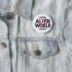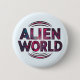 This button features the words "Alien World" in a bold font made up of a mesmerizing blend of spacey colors—deep cosmic blues, vibrant purples, and glowing nebula-like accents. Perfect for sci-fi fans, space enthusiasts, or anyone wanting to add a touch of intergalactic flair to their outfit, bag, or collection.