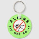 This keychain has a prohibitory traffic sign with a cartoonish flying saucer and a stylized pyramid on a white background, crossed by a red "forbidden" line. The sentence "aliens did not do it" in capital black letters runs all around the sign on a light green background.