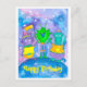 A fun happy birthday postcard featuring three whimsical alien creatures in bright colors standing on a planet in outer space with planets and stars illustrated with watercolor.