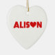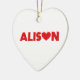 The name Alison with the letter o replaced with a red love heart. The colours can be changed.