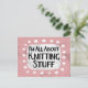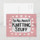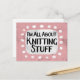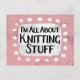 "I'm All About Knitting Stuff" is a cute text design in pink with black and red text, along with a white accent shape and white textured whimsical dots surrounding it.