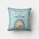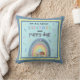 This cute pillow has a modern rainbow with two whimsical puppy dogs standing under it. The top row of the rainbow has little puppy dog prints climbing up both sides leading to a heart on top. Typography reads It's all about Rainbows and Puppy Dogs. The letters in "Rainbows" are all done in different colors and there are different colored dog bones are scattered about. Background is a pale sky blue with a darker blue and yellow border. Reverse side has a blue polka dot background. Toddlers, pre-teens, teenagers, college girls and puppy dog lovers alike will love this pillow!