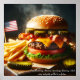 Indulge in pure burger bliss with this mouthwatering creation. A thick, juicy beef patty, grilled to perfection, is layered with melted cheddar cheese, crispy bacon, fresh lettuce, ripe tomato slices, and tangy pickles. All nestled between a toasted sesame seed bun and served with a side of golden, crispy fries. A miniature American flag adds a patriotic touch, making this a true celebration of classic American flavors.