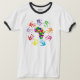 A t-shirt with the picture of children's hand prints in the shape of the planet Earth and at the very center, Africa. It describes the goal of Develop Africa itself: people working together to help the children of Africa.