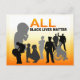 From womb until old age, and in every walk of life, ALL Black Lives Matter. Shown against an orange and yellow gradient background are silhouettes of Black people from various ages and occupations, including a fetus, a policeman, and an elderly woman in a wheelchair. There are also images of mothers with their children, a business man and woman, a policeman, and a protestor with lifted fist, showing a wide range of people who ALL matter.