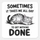 Stick it anywhere, do nothing everywhere. This funny lazy cat sticker features a delightfully unmotivated feline and the oh-so-relatable quote: "Sometimes it takes me all day to get nothing done."