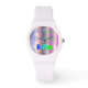 I only have one complaint. I ordered the watch with clear case and strap, and what was sent was white case and strap. I'm going to keep it because 1) it looks very nice in white, and 2) it would take too long to get a replacement made and sent in time for my occasion. Aside from the mix up with the color, the watch does look very good in white. The purple dial is actually sparkly which did not show in the online images. That was a nice surprise. If you like Swatch watches this is very similar to those. It's 33.6mm in diameter, 10.5mm thick, and 40.6mm lug to lug. Stainless steel case back says 3ATM/30m WR, so no swimming or showering or submerging this one. If you like Woodstock, this is a great choice.