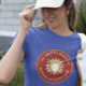 All I Need is a Sunny Day, Baseball and a Cold Beer written in classic white on dark red circle with a sunburst, baseball bats and a baseball in the center.. Other shirt colors are avaiable.