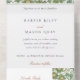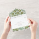This innovative all-in-one wedding invitation combines convenience with classic elegance. Adorned with a charming botanical print, the envelope liner and tear-away RSVP section feature a lush pattern of green leaves and golden-hued flowers, encapsulating the beauty of a garden in bloom. The invitation unfolds to reveal a cleanly designed invite, with details of the special day presented in a sophisticated font. This clever design not only captures the essence of a traditional wedding but also offers a modern solution for RSVP management, making it a perfect choice for eco-conscious couples looking to blend practicality with the timeless allure of nature-inspired motifs.