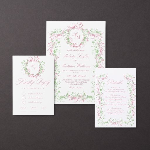 All in One Delicate French Flora Crest Wedding Invitation