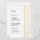 All in One Simple Modern Boho African Mudcloth Pattern Monogram Gold Foil Wedding Invitation... Inspired by African mudcloth textile designs, our unique "All in One" wedding invitation features a dramatic tribal pattern in real gold foil on a soft white background next to your invitation text and bride and groom monogram initials. The back of the invitation contains all of the details you would typically see on separate cards in the wedding packet, including reception time and venue, accommodation options, wedding website, RSVP and gift registry information. All example text can be easily revised with your own information on the personalization template.