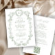 Elegant classic traditional floral French Victorian sage green toile de jouy chinoiserie style crest monogrammed charming budget affordable all in one wedding invitation with all the details, QR code to RSVP on website.