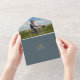 Introducing our beautiful 3-in-1 wedding invitation, featuring a Dusty Blue backdrop. The text is complimentary gold/yellow color. You can change the color as desired to suit your own preferences. Add an engagement, or couples photo to create a unique keepsake invitation. It includes a detachable RSVP card and the whole invitation folds and posts without the need for an envelope.